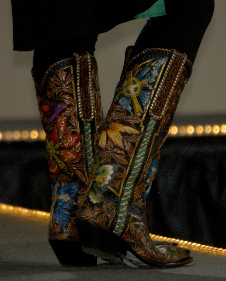 A model shows off a pair of boots designed by Scott Wayne Emmerich of Tres Outlaws during the Cody High Style Fashion show on Wednesday in Cody, Wyo.