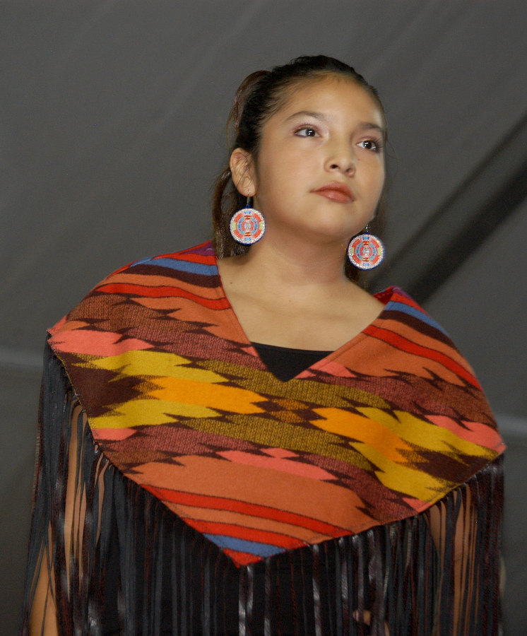 A model wears a garment made by designer Mildred Carpenter of Lodge Grass, Mont. during the Cody High Style Fashion show on Wednesday in Cody, Wyo.