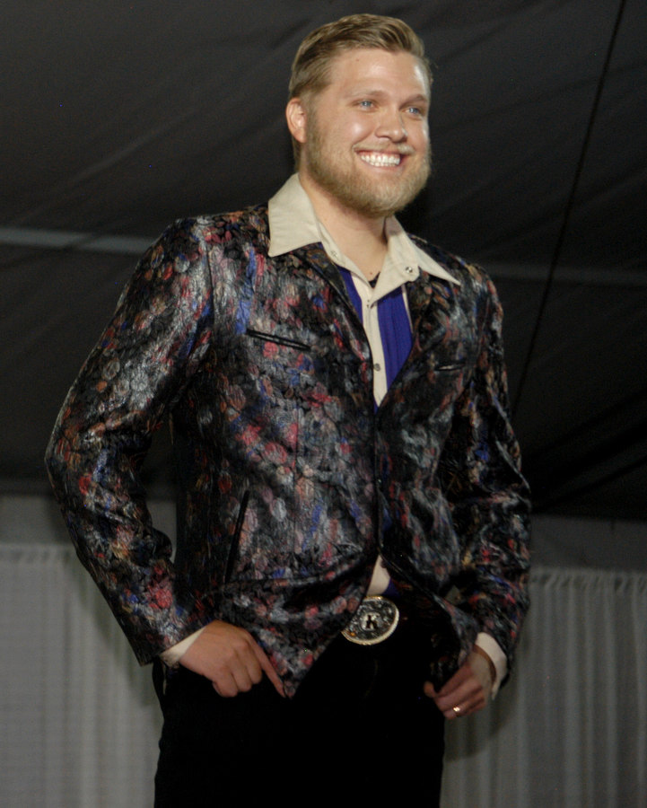 A model wears a jacket created by California designer Bob Kipperman during the Cody High Style Fashion show on Wednesday in Cody, Wyo.