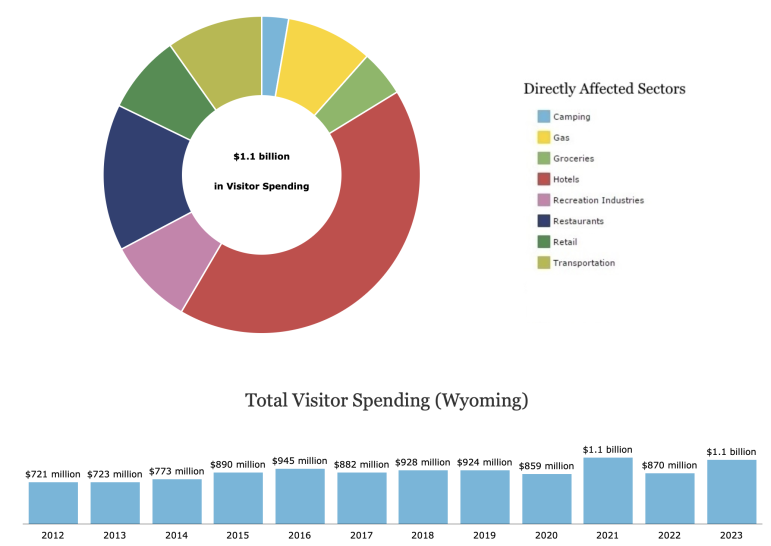 The National Park Service report, 2023 National Park Visitor Spending Effects, found that national park visitation contributed a total of $1.1 billion to Wyoming’s economy. It also showed that 325.5 million visitors spent $26.4 billion in communities near national parks.